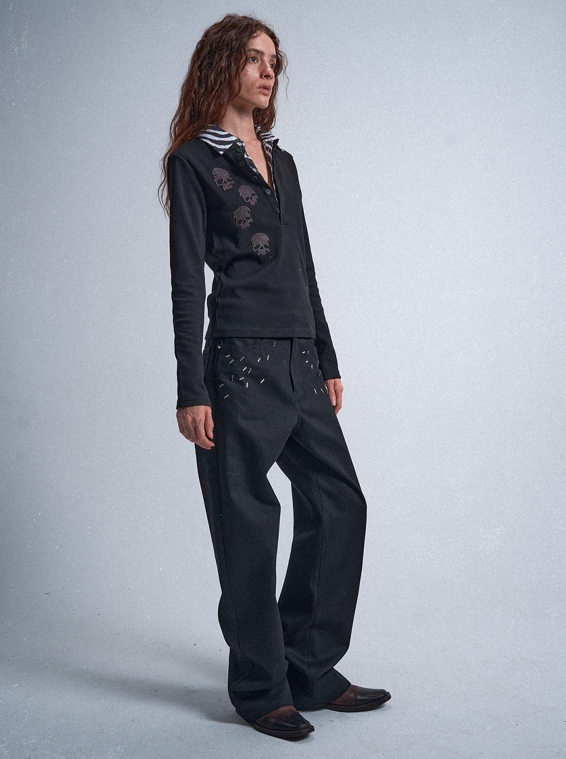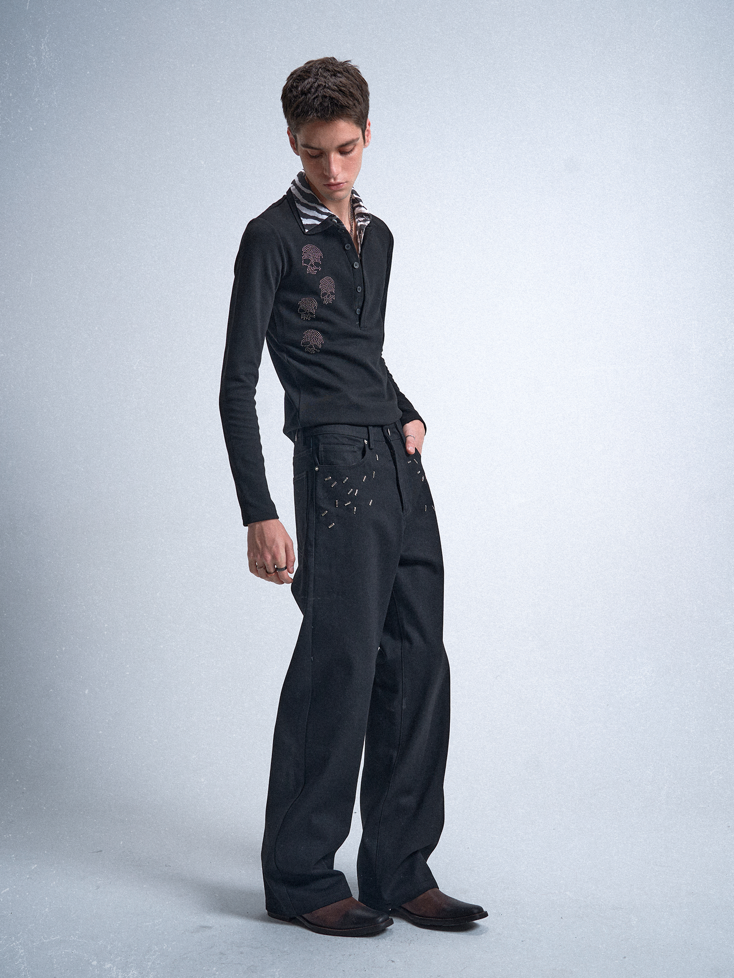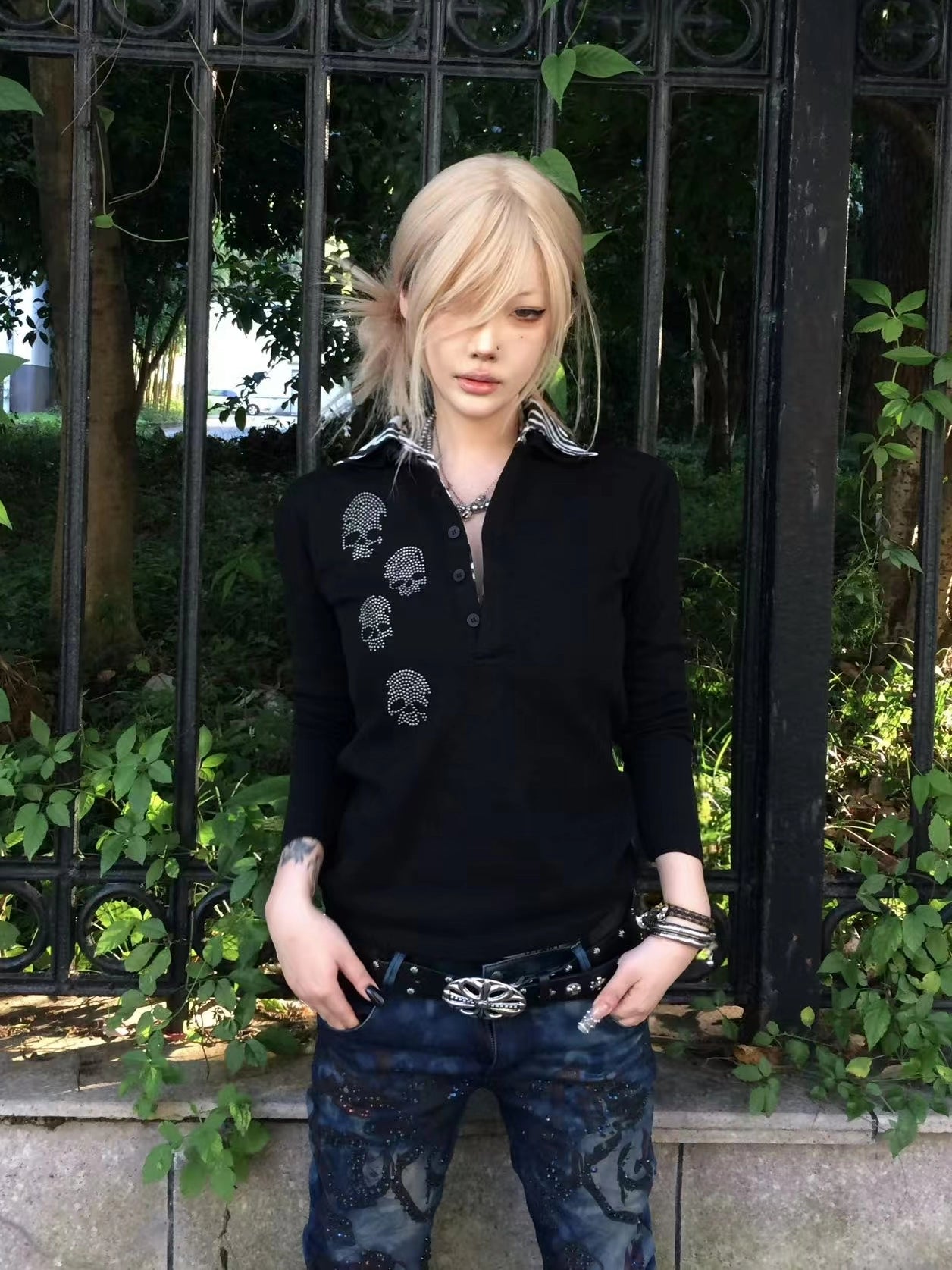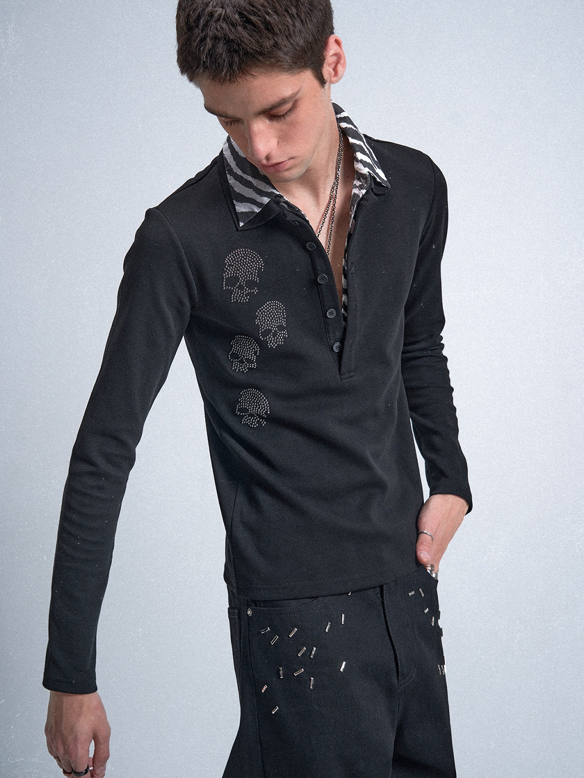 no E mosen | Double Collar Black White Striped Skull Sweatshirt【i0000000053】